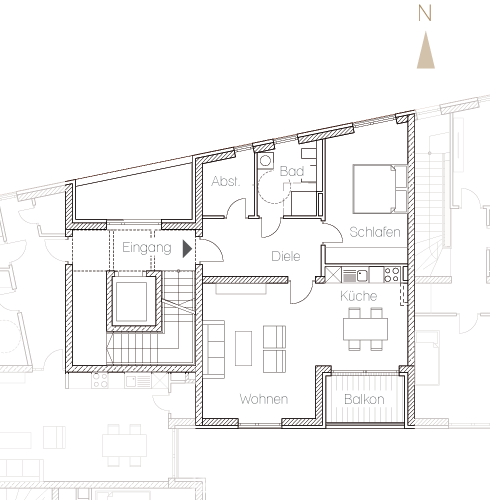 Der Grundriss der Nord-Süd ausgerichteten Wohnung mit herrlichem Südbalkon bietet auf 33 m² Platz für Wohnzimmer und Küche.